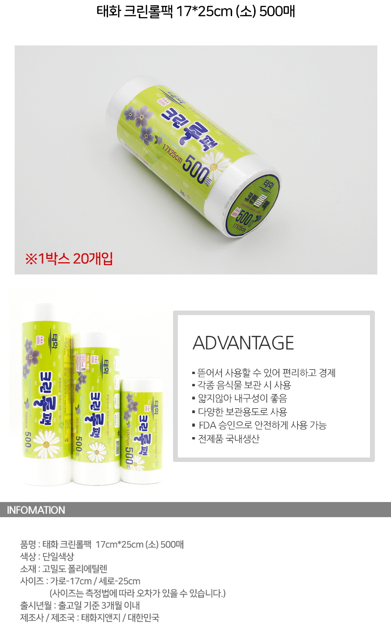 품목 또는 명칭 | 크린롤팩 소(17cmX25cm) 500매 |
